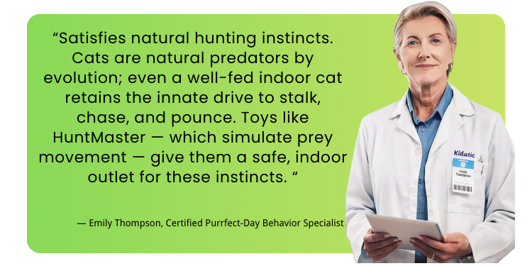 Yes! HuntMaster is designed for cats of all ages. You can easily adjust the speed (1500–3000 rpm) to match kittens, adult cats, or seniors — ensuring safe, comfortable, and enjoyable play for every cat.